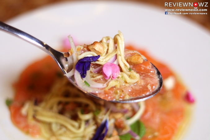 หน้าตาคล้ายคาร์ปาชิโอเป็นเนื้อแซลมอนหั่นเป็นแผ่นไม่บางมากตักแล้วยังไม่ขาด ปิดหน้าด้วยยำมะม่วงที่คลุกเคล้ามาเรียบร้อยราดด้วยน้ำยำจนฉ่ำโรยด้วยดอกไม้น่ารักสวยงาม