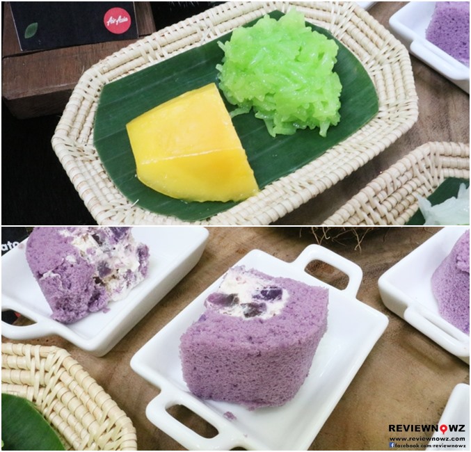 ขนมหวานก็มีด้วย ‘ข้าวเหนียวมะม่วง’ เหนียวนุ่มกับมะม่วงหวานๆ และ ‘เค้กโรลมันม่วง’ เครื่องเต็มไม่หวานไป