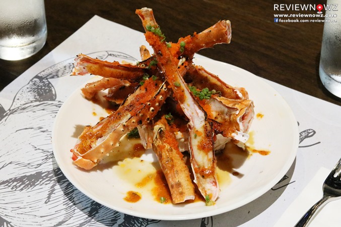 ปูอลาสก้าลนไฟเสิร์ฟพร้อมไข่ปลาค๊อดสไปซี่ เป็นเมนูที่ทำตามสั่งหอมมันเข้มข้ม แนะนำ
