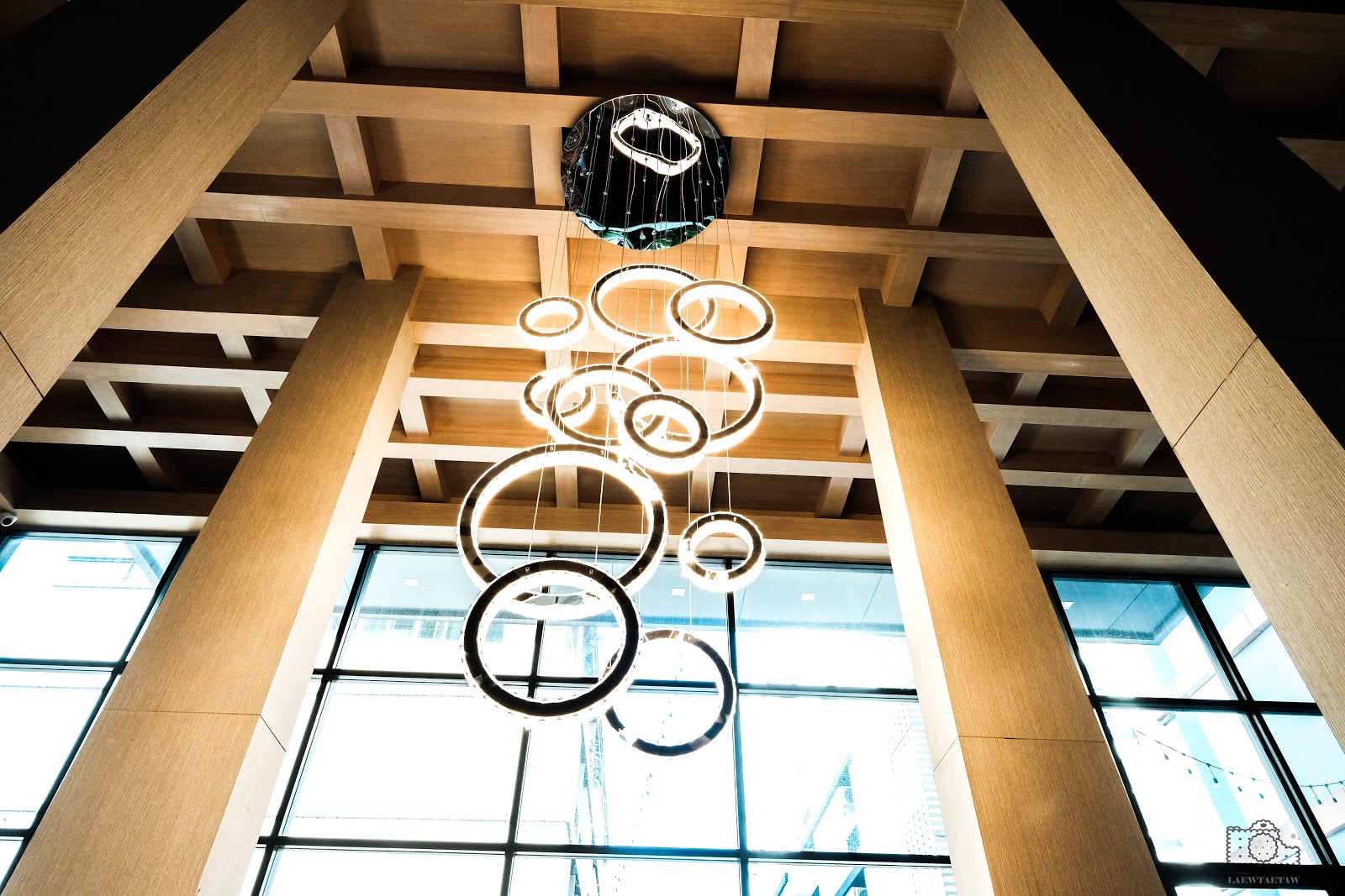 ตึกที่1 โซนลอบบี้ตกแต่งโทนสีขาวสะอาดตา ตัดด้วยเฟอร์นิเจอร์ไม้ และประดับด้วยโคมไฟ