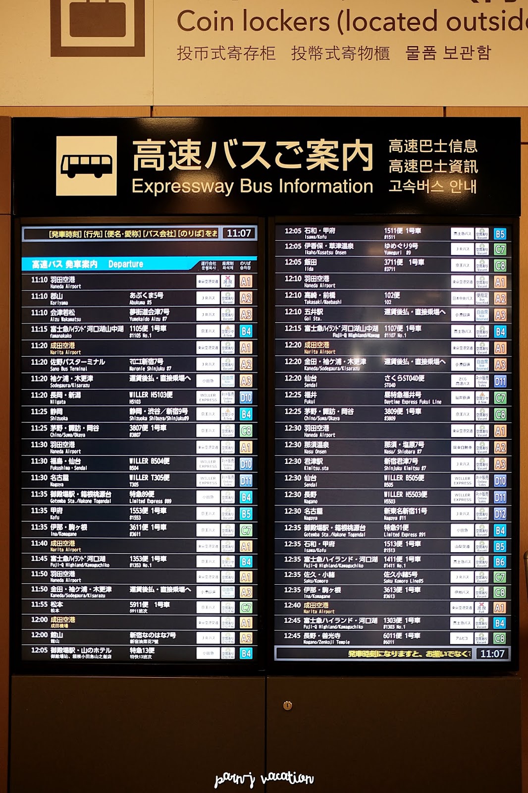 ฝากกระเป๋าเรียบร้อยก็เดินไปสถานี Expressway Bus สำหรับชินจูกุไปคาวากูจิโกะกัน ขึ้นไปที่ชั้น 4 ของอาคารสถานี แล้วก็จะเจอ Terminal สำหรับ Expressway Bus เราจองรอบแบบออนไลน์มาแล้วเรียบร้อย ถึงได้บอกว่าโชคดีที่เราผ่านทุกด่านมาทันรอบรถบัสได้ สาธุๆๆ เอกสารยืนยันการจองก็จะมี 2 แบบ คือปริ้นออกมา กับเป็นคิวอาร์โค้ดในมือถือ เนื่องจากยุคนี้ก็ต้อง paperless เนาะ เราก็เลยเลือกโค้ดในมือถือมา ดูรอบรถบัสของเราที่บอร์ด เพื่อดูว่าต้องไปรอที่ประตูไหน พอไปถึงก็โชว์ QR code ให้ดู พนักงานขับรถจะสแกนและยืนยันชื่อกับเรา จากนั้นก็ขึ้นรถได้ นั่งตามที่นั่งที่จองไว้