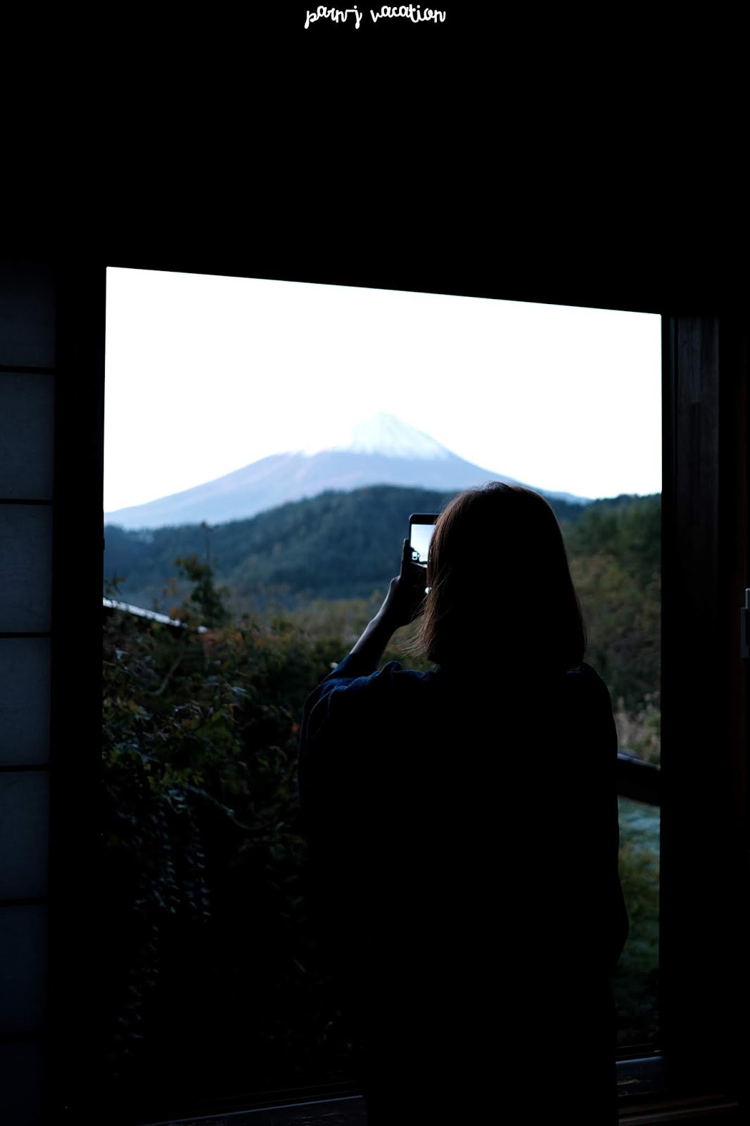 ห้องที่เราพักอยู่ริมสุดชั้น 1 ที่หน้าต่างเปิดอยู่ และห้องออนเซ็นที่เป็นบ้านสีน้ำตาล ต้นไม้ชุ่มฉ่ำมากกกกก เพราะมีหยาดน้ำค้างในตอนเช้า และคุณฟูจิซังที่ยอมออกมาทักทายกันแล้ว ♡