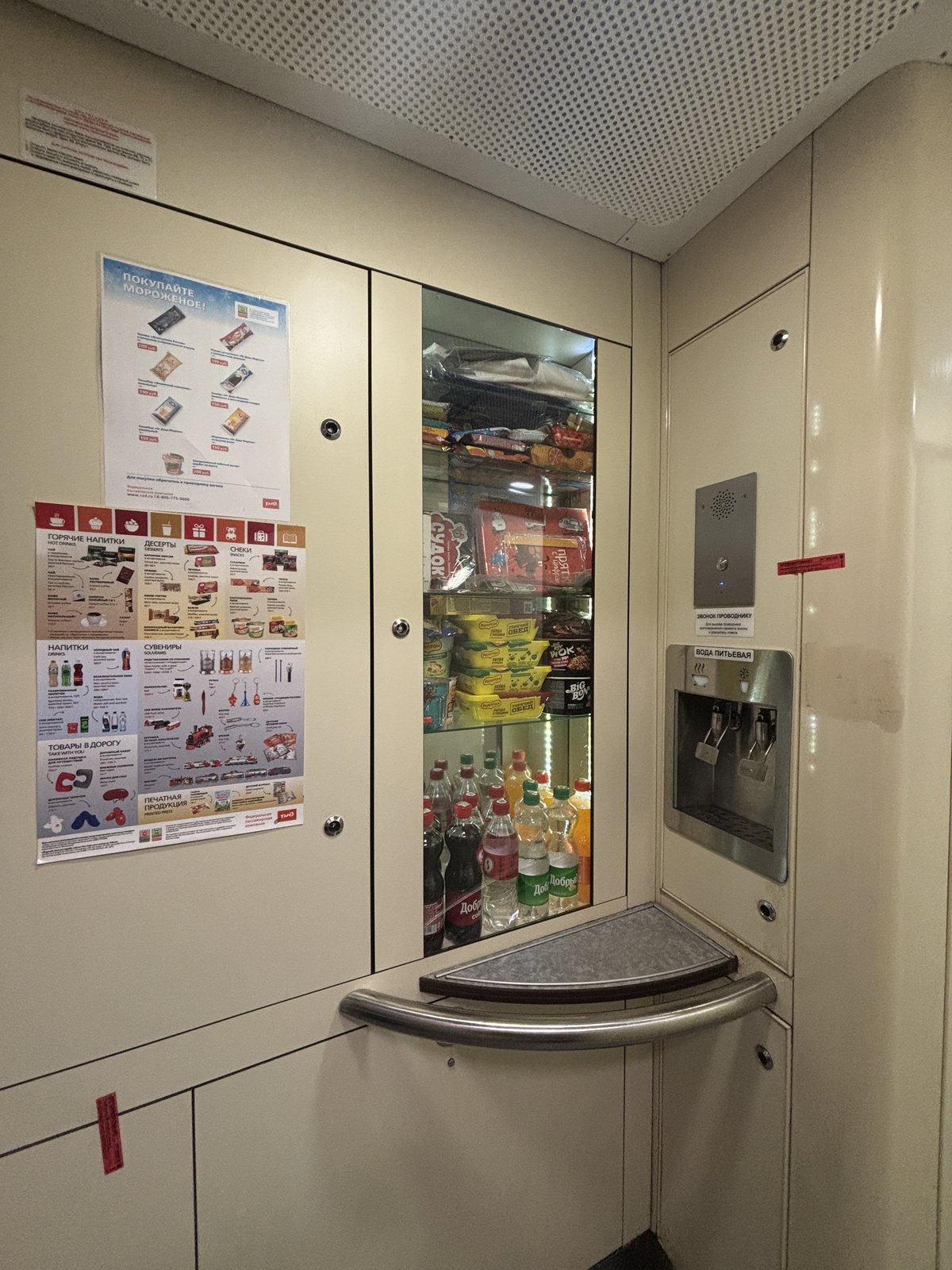 มาดูสิ่งอำนวยความสะดวกในรถไฟกัน แต่ละโบกี้ จะมีตู้ขายของให้ซื้อ พวกบะหมี่สำเร็จรูป น้ำอัดลม ชา กาแฟ ไอติมก็มีขายค่ะ และมีที่กดน้ำร้อน น้ำเย็นฟรีด้วย ดังนั้นไม่จำเป็นต้องแบกน้ำดื่มขึ้นไปเลย เราซื้อน้ำ 1.5 ลิตร ขึ้นไป 2 ขวด แบกขึ้นไปยังไง ก็แบกลงมาแบบนั้น ไม่ได้ใช้เลย เพราะกดน้ำเย็นบนรถไฟตลอด อิอิ อ้อ แต่ต้องเตรียมขวดน้ำ หรือแก้วน้ำไปกดนะ