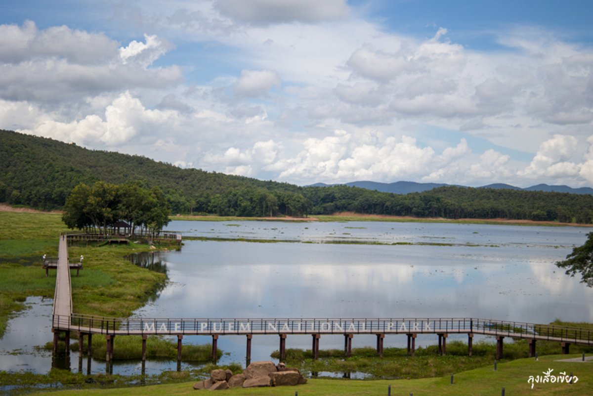 ที่ทำการอุทยานแห่งชาติแม่ปืม ตั้งอยู่ในอ่างเก็บน้ำแม่ปืม ผมขับรถมาจอดที่ด้านหน้าที่ทำการอุทยาน วิวเบื้องหน้าคือผืนน้ำที่อยู่ในอ้อมกอดของขุนเขา มีสะพานทอดยาวลงไปในพื้นที่อ่างเก็บน้ำ มองเห็นเงาสะท้อนของแผ่นฟ้าบนผืนน้ำอย่างสวยงาม